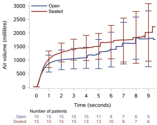Mean exhaled volume during spirometry over nine seconds with 95% confidence intervals and number of patients remaining at each second with open tracheostomy (blue line) and when sealed with the sealing disc (red line).