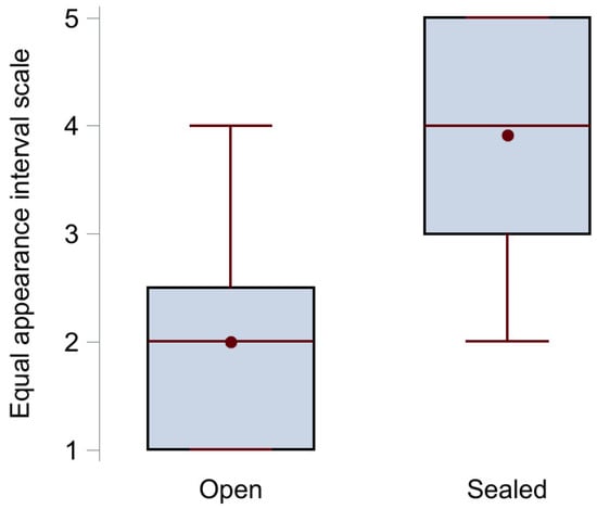 Box plot of the voice quality assessment results showing median (middle red line), mean (red circle), upper (75th percentile) and lower (25th percentile) quartile (black box), and maximum and minimum value (red whiskers) for the group with open tracheostomy (no sealing disc) and the group with sealed tracheostomy.