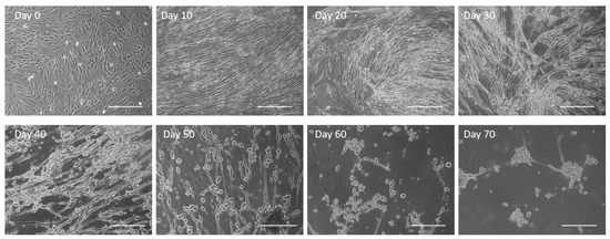 Untreated human skeletal muscle progression over a period of 70 days with deterioration in morphology observed as early as Day 30 and complete cell peeling by Day 60. Scale bar: 100 µm.