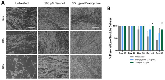 To test if MMP inhibition could preserve cell attachment for longer times, which could potentially serve as a viable way of increasing the longevity of iPSC skeletal muscle on the glass substrate, the effect of two MMP inhibitors, Tempol and Doxycycline, were tested in the muscle culture. The Doxycycline dosages tested were 0.1, 0.5, 1.0, and 2.0 µg/ml. The dose ranges were chosen based on the literature [31,32,46], and the optimal dose was determined based on its effect on muscle culture longevity in preliminary experiments, which indicated it to be 0.5 µg/ml (Supplementary Figure S1). Similarly, the Tempol dosages tested were 25, 50, 100, and 125 µM, and the dosage of 100 µM was chosen as optimal for subsequent experiments (Supplementary Figure S1). Figure 2A shows a comparison of the treated myotubes vs. untreated, indicating a morphological enhancement was maintained in the treated muscle cells in comparison to the untreated. At Day 35, the treated cultures indicated a more uniform distribution of myotubes across the surface, as opposed to the untreated culture, which showed gaps and some thinning of the myotubes. The spaces in the culture and bundled structures observed on Day 45 in the untreated culture were barely noticeable in the treated cultures. By Day 60, where the most significant difference was observed, the regular myotube morphology in the untreated culture had deteriorated, yet the morphology of the treated myotubes did not show a deterioration effect due to the culture age. Certain Doxycycline and Tempol treatments appeared to preserve proper myotube morphology until approximately Day 65, while the untreated cultures indicated deterioration as early as Day 35. Quantification of the cultures preserved over time indicated that 40% of the untreated cultures were peeled by Day 50 with repetitive functional testing (tested every 10 days by electrical stimulation), while the Doxycycline treatment indicated about 20% peeling, and the Tempol treatment had almost 0% peeling at Day 50, indicating at least 20 days prolongation of the muscle culture compared to the regular condition, with enhanced functional characteristics.