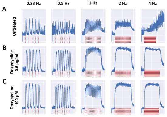 Sample stimulation–contraction traces from Day 30 under different treatment conditions. The electrical stimulation was applied at different frequencies ranging from 0.33 Hz to 4 Hz, as illustrated in red traces at the bottom. The myofiber contraction traces upon each stimulation are shown in blue at the top. (A) Untreated culture, (B) Doxycycline 0.5µg/mL culture, and (C) Tempol 100 µM culture.