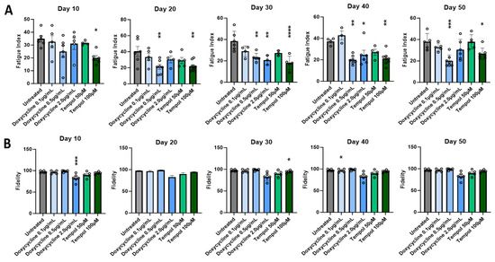 To ensure the functionality of the treated myotubes was preserved along with the morphology in the cultures treated with MMP inhibitors, the contractile function of the myotubes in response to field electrode stimulation at varied frequencies was tested. All myotubes were subjected to stimulated contraction at frequencies of 0.33, 0.5, 1.0, 2.0, and 4.0 Hz on Day 10, 20, 30, 40, and 50 post-differentiation, and compared to the untreated myotubes. Figure 3 shows the representative raw stimulation–contraction traces at Day 30, the red lines indicate the stimulation at increasing frequencies, and the blue lines indicate the muscle contraction response to the stimulation at given frequencies. While the amplitude of contraction of the treated myotubes at 0.5 μg/mL Doxycycline and 100 μM Tempol was close to 8000, the amplitude of the untreated myotube contraction was slightly below 4000, which was approximately half of the treated myotube amplitudes. The amplitude is proportional to the contractile force generation of the myotubes. Figure 3A at 4 Hz shows minimal contraction, initially, with background noise and some spontaneous contractions towards the end, where the amplitude continues to rise without any direct stimulation. This spontaneous contraction is one of the observations most representative of the untreated condition at Day 30, with the other being unresponsiveness to stimulation. Quantification of these functional data was performed to determine the differences between the treated and untreated myotubes and their temporal manifestation. Two functional parameters were analyzed: the fatigue index, which measures the extent of myofiber fatigue during a period of high-frequency stimulation, and fidelity, which measures the percentage of stimulation-induced myofiber contractions out of the total number of stimulations. Both were evaluated at multiple stimulation frequencies and the detailed explanation of these two parameters is described in [4]. As shown in Figure 4A, there is a significant reduction in the fatigue index in the treated myotubes compared to the untreated myotubes starting at Day 10 through 50. The difference is more prominent in later-stage cultures at D40 and D50, suggesting better preservation of muscle function by MMP inhibition. This analysis also reaffirmed the optimal dosage for Tempol (100 μM) and Doxycycline (0.5 μg/mL), which demonstrates the lowest fatigue index compared with other dosages. Figure 4B compares the contraction fidelity of the treated vs. untreated. The result displays a non-statistically significant change in the fidelity across myotubes, and that trend appears to remain constant over 50 days. The functional data support the hypothesis that while preserving morphology, Doxycycline and Tempol treatments can reduce muscle fatigue and maintain their contraction fidelity for longer periods of time.