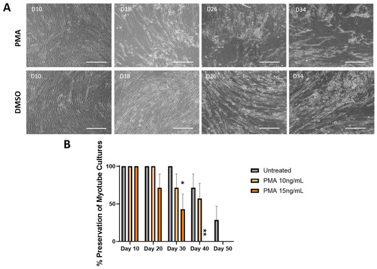 To confirm that the observations regarding morphology and functionality were preserved due to the mechanism of inhibiting MMP activity, cells were treated with an MMP inducer, PMA, to check for the reversal of these observations. The PMA was dissolved in DMSO prior to dosing, so a vehicle control of DMSO-treated culture was included. The final concentration of DMSO (v/v) in the well did not exceed 0.1%, with the 10 ng/mL treatment having 0.08% DMSO (v/v) and the 15 ng/mL having 0.1% DMSO (v/v). Figure 5A shows the cultures treated with 10 ng/mL of PMA. Cultures on Day 10 indicated a healthy morphology with minor spacing. The myotubes started to show gradual thinning and dramatic spacing with more bundle structures and aggregation between Days 14 and 26. On Days 30 and 34, small myotube fragments were observed, confirming the peeling of some myotubes, with Day 38 indicating a noticeable decrease in muscle mass, while myotubes were better preserved in the DMSO control condition. The effect of the PMA on the preservation of the muscle culture under two concentrations was quantified and is illustrated in Figure 5B. By Day 20, a 33.4% decrease in the number of myotubes was observed in the higher PMA concentration with the remaining 66.6% of cultures peeling by Day 30, with the control culture still having 100% of the myotubes remaining. Cultures treated with 10 ng/mL PMA dropped by 33.4% by Day 30 and showed a significantly larger fatigue index than the control, with the remaining 66.6% of cultures peeling by Day 40, while the control culture still maintained about 66% of the initial number of myotubes.