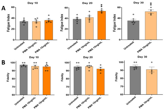 Effect of PMA on the contractile function of iPSC-derived SKM across 30 days. (A) Fatigue index. (B) Fidelity. Results are from 6 batches of experiments. Each circle represents one replicate. There were fewer than 6 replicates in some of the later groups, indicating the loss of some systems under PMA conditions. The statistical comparison was performed between each treated condition with the untreated condition. One-way ANOVA. Mean ± SEM. ** p < 0.01.