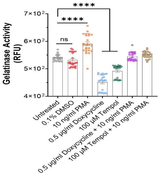 Visualization of gelatinase activity in the medium across all the cultures at Day 42 utilizing gelatinase activity assay. PMA-treated cultures showed a significantly higher activity compared to untreated cultures, while inhibitor-treated cultures showed significantly reduced activity. Combination of the gelatinase inhibitor and activator canceled out the effect. Data represented from 24 replicates collected from 3 batches of experiments. One-way ANOVA. Mean ± SEM. ns, no significant difference, **** p < 0.0001.