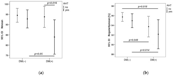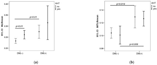 Dependence of WLR and IMTLR mean on arterial pressure in both groups (a,b). AHT-arterial hypertension, measured in the brachial artery. AHT (no) if SBPb < 140 mmHg and DBPb < 90 mmHg; AHT (yes) if SBPb ≥ 140 mmHg or DBPb ≥ 90 mmHg. CI—Confidence Interval. p—value was calculated by Mann–Whitney U test.