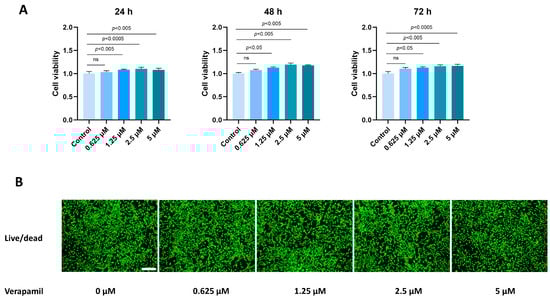 Toxicity of verapamil on tenocytes at different concentrations. (A) The effects of verapamil on cell viability were assessed via a CCK8 assay at 24, 48, and 72 h. (B) Live/dead cell staining of tenocytes treated with 0, 0.625, 1.25, 2.5, or 5 μM verapamil. Scale bar, 250 μm. Data are presented in the form of mean ± standard deviation, n = 3. A difference was deemed no significant (ns) if the p-value was greater than 0.05.