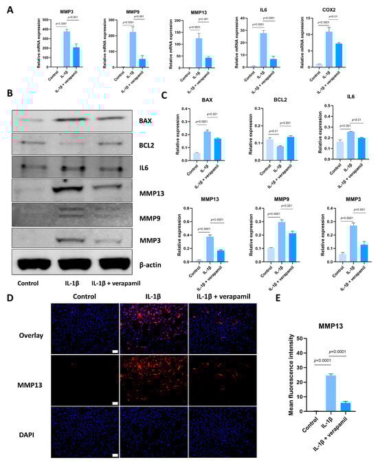 Verapamil protects tenocytes from extracellular matrix degradation, inflammation, and apoptosis induced by IL−1β. (A) The relative mRNA expression of IL6, COX2, MMP3, MMP9, and MMP13 analyzed via qPCR. (B) The protein level of BAX, BCL2, IL6, MMP3, MMP9, and MMP13 detected by means of Western blot. (C) Quantitative results of BAX, BCL2, IL6, MMP3, MMP9, and MMP13 detected by means of Western blot. (D) Immunofluorescent images of MMP13 obtained in combination with DAPI staining for the cell nucleus. Scale bar, 100 μm. (E) Quantitative results of MMP13 immunofluorescence. Data are presented in the form of mean ± standard deviation, n = 3.