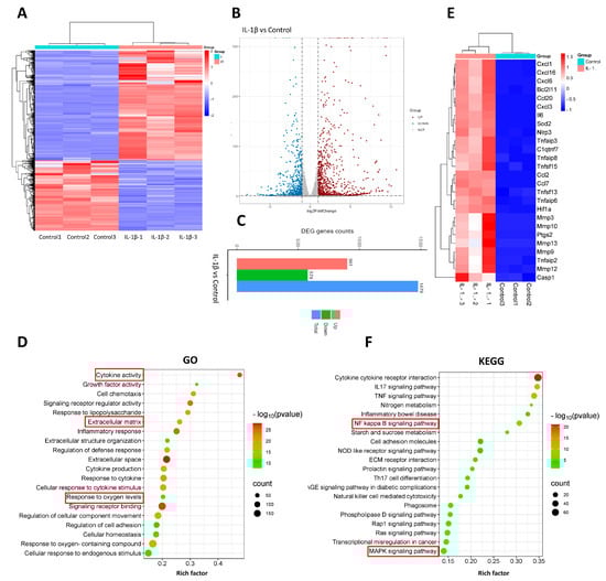 RNA sequencing and analysis comparing normal tenocytes with those stimulated by IL −1β. (A) Heatmap of genes differentially expressed between normal tenocytes and those stimulated with IL−1β. (B) Volcanol plot of genes differentially expressed between normal tenocytes and those stimulated by IL−1β. (C) Chart of differentially upregulated and downregulated genes between normal tenocytes and those stimulated with IL−1β; genes with |log2FC| > 1 and p-adjust < 0.05 were considered to be significantly different expressed genes. (D) Gene Ontology (GO) enrichment analysis of differentially expressed genes; rich factor is the ratio of differentially expressed protein number annotated in this pathway term to all protein number annotated. (E) Inflammatory activity-, apoptosis-, extracellular matrix degradation-, and oxidative stress-related genes. (F) Kyoto Encyclopedia of Genes and Genomes (KEGG) pathway analysis; rich factor is the ratio of differentially expressed protein numbers annotated in this pathway term to all annotated protein numbers. n = 3.
