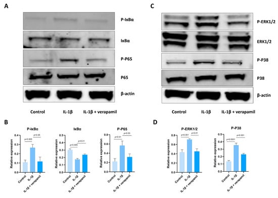 The involvement of the NFκB and MAPK pathways in inflammation and apoptosis has been well documented in the literature [28,29], and our sequencing results showed that the NFκB and MAPK pathways are enriched in tenocytes stimulated by IL−1β. Hence, we conducted an analysis to assess the alterations in the expression levels of proteins associated with these pathways. Remarkably, the outcomes obtained from Western blots indicated a substantial upregulation of the core proteins P-P65, P-IκBα (Figure 4A,B), and P-ERK1/2, P-P38 (Figure 4C,D), which serve as vital indicators of the functional NFκB and MAPK pathways, respectively. Importantly, our subsequent investigations revealed that the administration of verapamil effectively attenuated this observed trend. Collectively, these results suggest that verapamil inhibits the activation of MAPK and NFκB pathways in IL−1β-induced tenocytes.