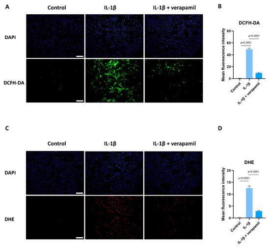 Protective effect of verapamil on IL−1β-induced oxidative stress in tenocytes. (A) DCFH-DA probe and DAPI staining for nucleus. Scale bar, 200 μm. (B) Quantitative results of DCFH-DA. (C) Dihydroethidium probe and DAPI staining for nucleus. Scale bar, 200 μm. (D) Quantitative results of DHE. Data are presented in the form of mean ± standard deviation, n = 3.
