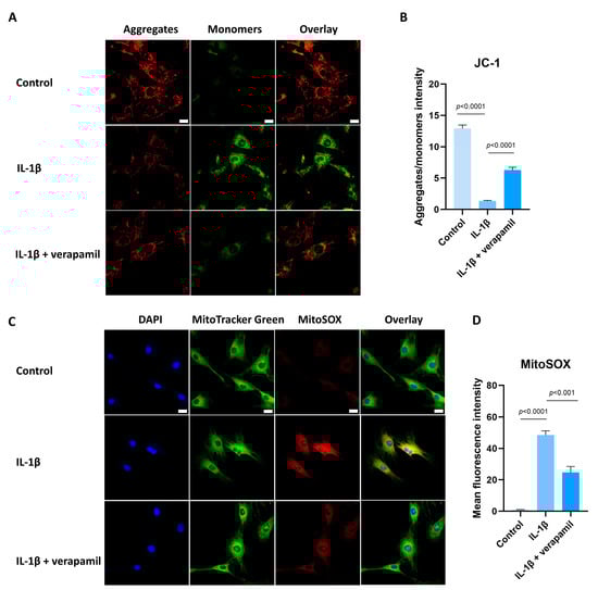 Previous reports suggested that oxidative stress is closely related to extracellular matrix degradation, inflammation, and apoptosis [24,30,31]. Consequently, ROS levels were assessed by employing the DCFH-DA fluorescent probe. The findings revealed a substantial increase in ROS prompted by IL−1β, while verapamil was able to reverse this increase (Figure 5A,B). In accordance with these outcomes, the superoxide anion probe dihydroethidium (DHE) exhibited a parallel pattern (Figure 5C,D). Collectively, these findings strongly point to the antioxidant efficacy of verapamil. It is noteworthy that mitochondria serve as pivotal sites for intracellular ROS generation. Detecting changes in the mitochondrial membrane potential is crucial for evaluating mitochondrial function. In this study, the JC-1 probe was employed to effectively ascertain alterations in the mitochondrial membrane potential. The results unequivocally demonstrated a sharp decrease in mitochondrial membrane potential (Figure 6A,B), which was mitigated by verapamil intervention. Furthermore, verapamil treatment led to a notable inhibition of mitochondrial superoxide production compared to IL−1β stimulation (Figure 6C,D). Taken together, these fluorescent microscopy data underscore the potential of verapamil to suppress IL−1β-induced oxidative stress by enhancing mitochondrial function.