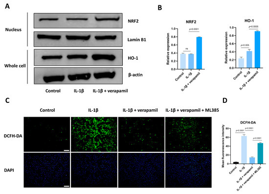 We conducted an analysis on the state of Nrf2 within the nucleus, during which our observations made it clear that the extent of nuclear translocation experienced no significant augmentation when stimulated with IL−1β, but the downstream genes, such as HO-1, increased slightly. This patterning suggests a disruption in the equilibrium of intracellular oxidative stress, implying spontaneous intracellular regulation to maintain homeostasis. The addition of verapamil emphatically amplified the translocation magnitude of Nrf2 to the nucleus and the expression of its corresponding downstream gene HO-1. Furthermore, the application of Nrf2 inhibitor ML385 reversed the protective effect of verapamil, leading to increased levels of intracellular oxidative stress and inflammation, as well as impaired mitochondrial function. This compelling evidence underscores the fact that verapamil exerts its antioxidant effects by activating the Nrf2/HO-1 pathway.