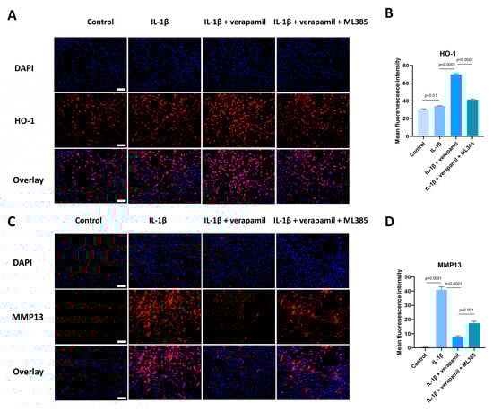 ML385 reverses the protective effect of verapamil. (A) Immunofluorescent images of HO-1 obtained in combination with DAPI staining for the cell nucleus among the control, IL−1β, IL−1β + verapamil, and IL−1β + verapamil + 2 μM ML385 groups. Scale bar, 150 μm. (B) Quantitative results of HO-1 staining among the control, IL−1β, IL−1β + verapamil, and IL−1β + verapamil + 2 μM ML385 groups. (C) Immunofluorescent images of MMP13 obtained in combination with DAPI staining for the cell nucleus among the control, IL−1β, IL−1β + verapamil, and IL−1β + verapamil + 2 μM ML385 groups. Scale bar, 150 μm. (D) Quantitative results of MMP13 staining among the control, IL−1β, IL−1β + verapamil, and IL−1β + verapamil + 2 μM ML385 groups. Data are presented in the form of mean ± standard deviation, n = 3.