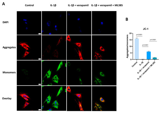 ML385 has the capacity to reverse the protective function of verapamil on the mitochondrial membrane potential. (A) Fluorescent images of JC-1 staining among the control, IL−1β, IL−1β + verapamil, and IL−1β + verapamil + 2 μM ML385 groups. (B) Quantitative results of JC-1 staining among the control, IL−1β, IL−1β + verapamil, and IL−1β + verapamil + 2 μM ML385 groups. Scale bar, 20μm. Data are presented in the form of mean ± standard deviation, n = 3.