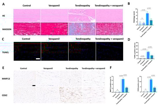 Evaluation of the protective effect of verapamil on rat tendons in vivo. (A) HE and Masson’s trichrome staining of tendons. Scale bar, 100 μm. (B) Histology score of HE staining among the four groups. Scale bar, 100 μm. (C) TUNEL staining among the four groups. (D) Quantitative results of TUNEL staining. (E) Immunohistochemical staining of MMP13 and COX2 among the four groups. Scale bar, 100 μm. (F) Quantitative results of immunohistochemical staining of MMP13 and COX2. Data are presented in the form of mean ± standard deviation, n = 6.