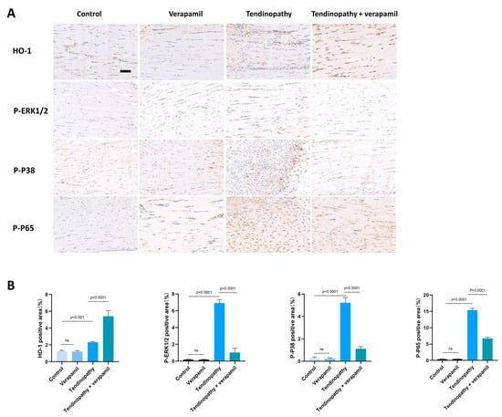 Finally, we conducted an assessment of the protective effects of verapamil administration in a collagenase-I-induced tendinopathy model. Histological analysis using HE and Masson’s trichrome staining revealed a pronounced disorganization and lax arrangement of collagen fibers in the tendinopathic tendon compared to the control group. Remarkably, verapamil treatment successfully ameliorated the structural disorder of collagen fibers in the tendinopathic tendon, and the whole histological damage decreased on the whole (Figure 10A,B). Additionally, subsequent TUNEL staining studies revealed a heightened proportion of apoptotic cells in tendinopathy tissues, which was mitigated by the injection of verapamil (Figure 10C,D). Furthermore, we employed immunohistochemical staining to investigate the expression levels of inflammatory, extracellular matrix degradation, and antioxidant markers. Our findings indicated a significant increase in the expression of matrix metalloproteinase 13 (MMP13) and inflammatory factors, such as cyclooxygenase 2 (COX2), in the collagenase-I-induced group as compared to the control group, and this trend was reversed by verapamil treatment (Figure 10E,F). Consistent with these results, activation of the NFκB and MAPK pathways was inhibited when treated with verapamil compared to the tendinopathy group (Figure 11A,B). In addition, the antioxidant gene (HO-1) was upregulated during tendinopathy, which means that the body’s autonomous antioxidant system was activated, and verapamil treatment significantly increased the level of HO-1 (Figure 11A,B). Taken together, these results provide compelling evidence that verapamil administration exerts a rescuing effect on the injured Achilles tendon in our experimental model of tendinopathy.