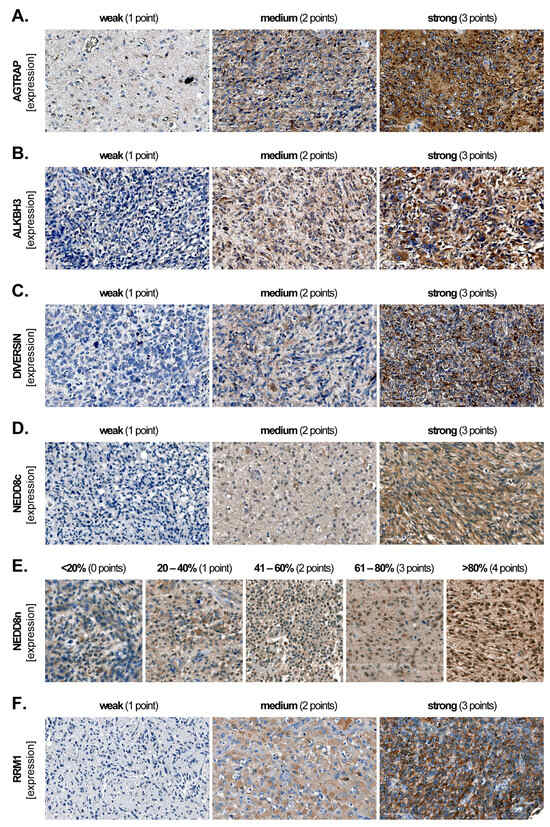 Marker expression in GBM tissues. Representative micrographs showing weak (1 point), medium (2 points) and strong (3 points) cytoplasmic expression of (A) AGTRAP, (B) ALKBH3, (C) DIVERSIN, (D) NEDD8c and (F) RRM1. The H-score was subsequently calculated according to the formula (1 × X) + (2 × Y) + (3 × Z), where X + Y + Z = 100% of the total tumour area. (E) The 5-tier score for nuclear NEDD8 (NEDD8n) according to the percentage of positive cells.