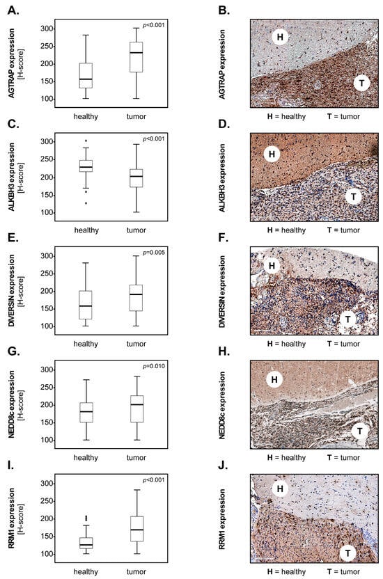 Marker expression in healthy versus GBM tissues. Expression of (A) AGTRAP, (C) ALKBH3, (E) DIVERSIN, (G) NEDD8c and (I) RRM1 in GBM (n = 186) and tumour-free adjacent brain tissues (n = 54). The medians are shown as black lines and the percentiles (25th and 75th) as vertical boxes with error bars. The outliers are indicated by circles. Statistical analysis was performed with the Mann–Whitney U test, and the p-values are indicated in the upper-right corner of each plot. (B,D,F,H,J) Representative micrographs showing the expression of the markers in the solid tumour area (T) versus the adjacent, tumour-free tissue area (H).