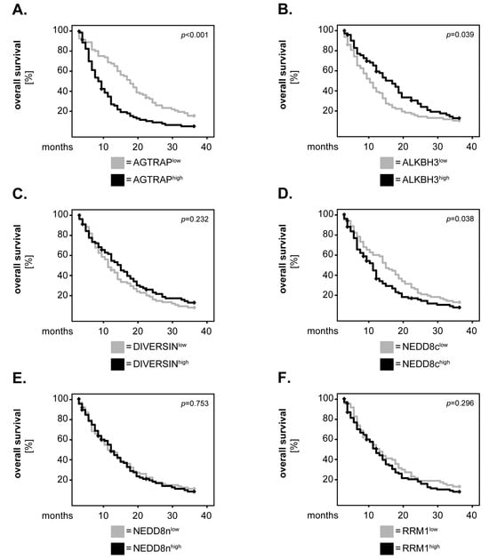 Next, we tested whether our biomarker candidates might associate with the 12-month progression-free survival (PFS) of the GBM patients. The survival analysis was performed as described above. From all markers tested, only two showed significant associations with the PFS of GBM patients. Specifically, patients with high levels of AGTRAP (Figure 5A) and NEDD8c (Figure 5D) had a significantly shorter PFS than patients with low levels of these markers (AGTRAP: p < 0.001, log-rank; NEDD8c: p = 0.028, log-rank). ALKBH3, DIVERSIN, NEDD8n and RRM1 did not associate with the PFS of GBM patients, regardless if the cut-off was set according to the median-split method (Figure 5B,C,E,F) or based on the median values of the healthy tissues.