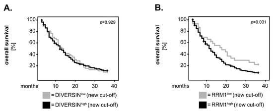 For DIVERSIN (Figure 3C), NEDD8n (Figure 3E) and RRM1 (Figure 3F), there was no significant difference regarding OS between patients with high and those with low expression levels of these markers (p = 0.232, p = 0.753 and p = 0.296, log-rank, respectively). We consequently sought to determine whether the dichotomisation of these markers into ‘low’ and ‘high’ using a new cut-off might yield other results. Since DIVERSIN and RRM1 were differentially expressed in healthy brain compared to the GBM tissues, we selected the median values of the healthy samples as the new cut-off. Even under these conditions, there was no significant difference in OS between DIVERSINhigh and DIVERSINlow patients (p = 0.929, log-rank; Figure 4A). However, we now found a significant association between high levels of RRM1 and a shorter survival of the GBM patients (p = 0.031, log-rank; Figure 4B). NEDD8n could not be analysed with the new cut-off, as its expression levels were similar in both healthy and tumour tissues.