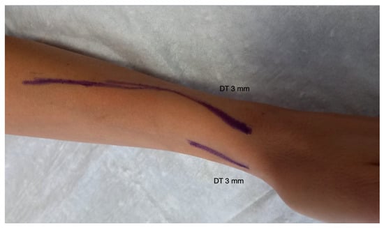The procedures were carried out in the operation room equipped with a DUS (Siemens Acuson P500, Healthineers, Mountain View, CA, USA) in a standardized fashion. Baseline DUS investigation included complete arterial and vein assessment with flows, diameters, and cutaneous markers (Figure 1).