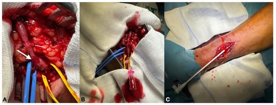 (A,B) Vascular access from the efferent vein (white arrow), 1 cm after the anastomosis (black arrow); (C) with 5F introducer radial sheath in a retrograde fashion.