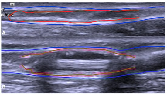 DEB positioned at the level of the lesion (A) and after achieving of nominal pressure (B). The blue lines indicate the outline of the vein while the red lines delineate the edges of the balloon.