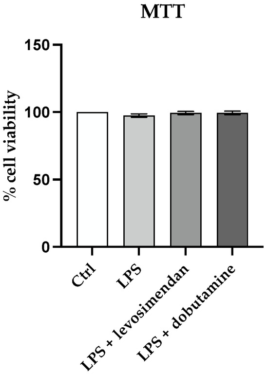 Cell viability was assessed after HMC3 cell incubation with LPS alone or with levosimendan or dobutamine in order to evaluate whether the selected concentrations could have cytotoxic effects. Control cells (unstimulated and untreated) exhibited one hundred percent viability following 24 h. Neither LPS challenge nor the co-incubation with levosimendan or dobutamine affected HMC3 cell viability, thus demonstrating that the used concentrations were appropriate (Figure 1).