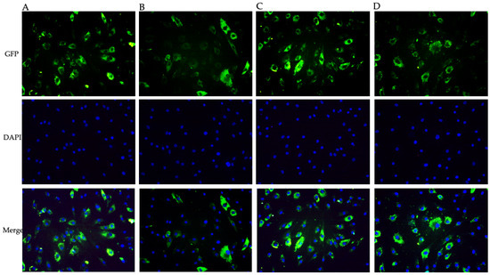 The panel shows immunofluorescence reactions using an anti-Nrf-2 antibody (green fluorescence) in HMC3 cells from Ctrl (A), LPS (B), LPS + levosimendan (C) and LPS + dobutamine (D) groups. All images were captured at 10× magnification. GFP: green fluorescent protein; DAPI: 4′,6-diamidino-2-phenylindole.