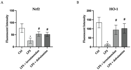 Intracellular ROS production was evaluated to explore levosimendan and dobutamine antioxidant effects in this model of neuroinflammation. LPS challenge markedly stimulated intracellular ROS release compared to the control cells (Figure 2B). Instead, intracellular ROS production was significantly reduced in HMC3 cells stimulated with LPS and co-incubated with levosimendan or dobutamine compared to the untreated cells (Figure 2C–E), thus indicating that the use of these drugs might be useful in reducing ROS accumulation during neuroinflammation. To better evaluate the possible antioxidant effects of levosimendan and dobutamine, Nrf2 and HO-1 protein levels, which finely modulate the antioxidant response, were analysed in HMC3 cells. A marked reduction in Nrf2 and HO-1 protein expression was observed in the HMC3 cells stimulated with LPS compared to the controls (Figure 3B and Figure 4B) as a result of the oxidative stress induction triggered by LPS; on the other hand, LPS-challenged cells co-incubated with levosimendan or dobutamine showed a marked increase in Nrf2 and HO-1 protein expression compared to LPS-stimulated cells as demonstrated by the increase in the fluorescence signal showed in Figure 3C,D, Figure 4C,D and Figure 5A,B.