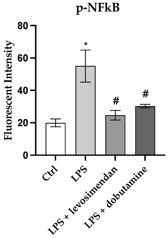 The graph shows p-NF-κB fluorescent quantification performed with Image-J (version 1.54h). The data are expressed as mean ± SD. * p < 0.05 vs. Ctrl; # p < 0.05 vs. LPS.