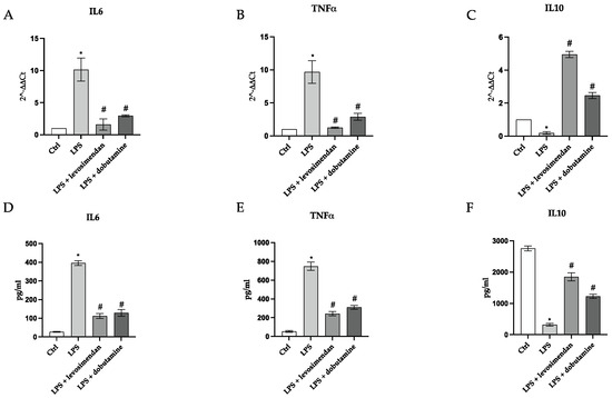 The gene expression of the transcription factor NF-κB, of the pro-inflammatory mediators TNF-α and IL-6, and the anti-inflammatory cytokine IL-10 were investigated to study levosimendan and dobutamine anti-inflammatory effects in this model of neuroinflammation. The LPS stimulus induced a significant upregulation in p-NF-κB protein expression compared to the control cells (Figure 6B). Both levosimendan and dobutamine treatment significantly reduced p-NF-κB protein expression compared to the LPS-challenged cells (Figure 6C,D and Figure 7). The LPS stimulus and the consequent NF-κB activation also caused a significant increase in TNF-α and IL-6 gene expression as well as a marked decrease in IL-10 mRNA expression compared to the control group (Figure 8A–C). The treatment with levosimendan and dobutamine significantly reduced TNF-α and IL-6 gene expression, and upregulated IL-10 mRNA expression compared to the LPS group (Figure 8A–C). Furthermore, to confirm the anti-inflammatory effects of levosimendan and dobutamine, the mature protein levels were evaluated in the supernatants of the HMC3 cells. LPS-challenged cells showed a marked increase in TNF-α and IL-6 protein expression with a concomitant significative reduction in IL-10 protein levels compared to the control cells (Figure 8D–F). By contrast, levosimendan and dobutamine treatment dampened TNF-α and IL-6 protein levels and increased IL-10 protein expression in the HMC3 cells stimulated with LPS (Figure 8D–F).