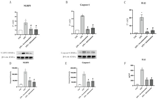 The effects of levosimendan and dobutamine treatments on the NLRP3 pathway were investigated by using RT-qPCR, Western blotting, and an ELISA assay. LPS stimulation and the consequent NF-κB activation caused a significant increase in the mRNA expression of NLRP3 in HMC3 cells compared to the controls (Figure 9A). Instead, levosimendan or dobutamine treatment caused a marked reduction in NLRP3 mRNA expression compared to LPS-challenged cells (Figure 9A). To deeply explore the inflammatory cascade triggered by NLRP3 activation, we also evaluated its downstream signal and, more specifically, the mRNA expression of caspase-1 and IL-β in the HMC3 cells challenged with LPS. We observed that the LPS stimulus caused a significant increase in caspase-1 and IL-1β mRNA expression compared to the control cells (Figure 9B,C). On the other hand, levosimendan or dobutamine treatment markedly reverted the gene expression increase of the NLRP3 downstream markers in LPS-stimulated cells (Figure 9B,C). To confirm the levosimendan and dobutamine inhibitory effects on the NLRP3 cascade, we also evaluated the mature protein. A significant increase in NLRP3, Caspase-1, and IL-1β protein levels were detected following the LPS challenge compared to those observed in the control cells (Figure 9D–F). On the other hand, levosimendan or dobutamine treatment caused a significant decrease in these protein levels compared to LPS group (Figure 9D–F), indicating that levosimendan and dobutamine can inhibit the NLRP3 pathway during neuroinflammation.