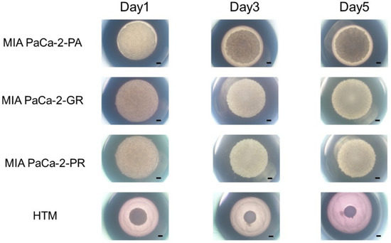 3D spheroid cultures of MIA PaCA-2-PA and -GR or -PR. Approximately 20,000 cells of MIA PaCa-2-PA, MIA PaCa-2-GR, or MIA PaCa-2-PR were subjected to a 3D drop cell culture to form 3D spheroids. As a representative non-cancerous human cell line, 20,000 cells of human trabecular meshwork (HTM) were also subjected to the 3D spheroid culture. Representative phase contrast microscopy images of these cells on Day 1, 3, and 5. Scale Bar: 100 μm.