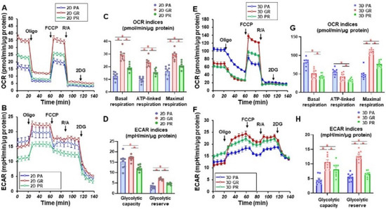 Oxygen consumption rate (OCR) and extracellular acidification rate (ECAR) in 2D and 3D cultured MIA PaCa-2-P, -GR, or -PR cells were measured using a Seahorse XFe96 real-time metabolic analyzer (Agilent Technologies, Santa Clara, CA, USA). On the day of assay, an XFe96 Cell Culture Microplate (Agilent Technologies, #103794-100) was coated with Cell-Tak™ (Corning #354240, Corning, NY, USA). In brief, 200 μL of 2 mg/mL Cell-Tak in 5% acetic acid was added in 2.8 mL of 0.1 M sodium bicarbonate, and then 30 μL of this Cell-Tak Mix was placed in each well of a microplate and incubated for 1 h in a non-CO2 incubator at 37 °C. Following the incubation, Cell-Tak Mix was aspirated from the plate, and the plate was washed twice with 400 µL of sterile 37 °C water and allowed to air dry. Approximately 10,000 2D-cultured cells and six 3D-cultured spheroids were resuspended to a pre-warmed 50 μL Seahorse XF DMEM assay medium (pH 7.4, Agilent Technologies, #103575-100) containing 5.5 mM glucose, 2.0 mM glutamine, and 1.0 mM sodium pyruvate and were seeded onto each well in the pre-made Cell-Tak coated Seahorse assay plate. The plate was incubated in a CO2-free incubator at 37 °C for 1 h prior to the measurements.