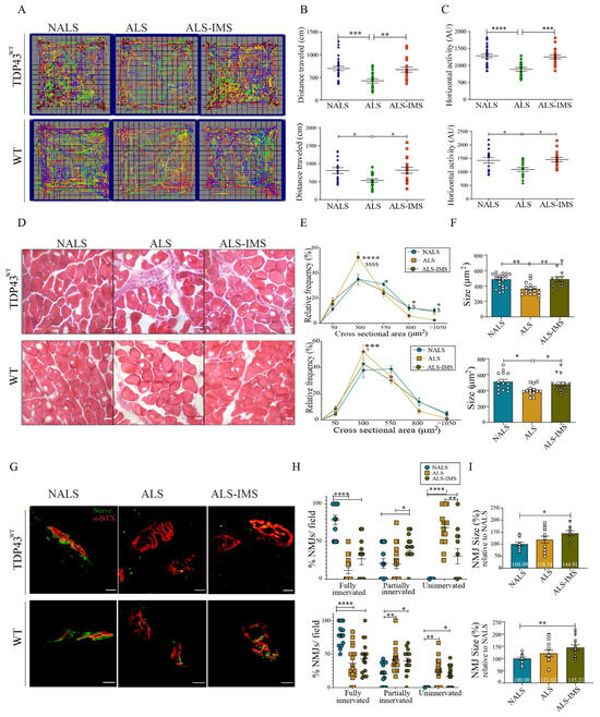 Statistical analyses were carried out with GraphPad Prism 8.0 (GraphPad, Inc., San Diego, CA, USA), using a one- or two-way ANOVA with Tukey’s post-hoc test or Bonferroni post-hoc test. The results are presented as mean ± SEM and were considered significant when * p < 0.05, ** p < 0.01, *** p < 0.001, **** p < 0.0001 NALS v/s ALS, NALS v/s ALS-IMS, ALS v/s ALS-IMS; or $ p < 0.05, $$ p < 0.01, $$$ p < 0.001, $$$$ p < 0.0001 ALS v/s ALS-IMS, as specified.
