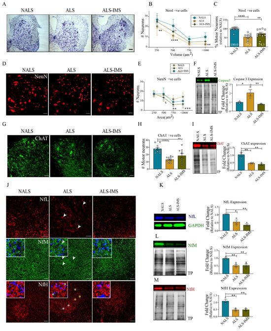 IMS-088 administration reduced loss of spinal neurons and neurofilament disorganization in mice exposed to ALS-CSF. Spinal cord sections stained with Cresyl violet (A) and quantified (B,C) as well with NeuN (D,E), respectively. Scale bar = 50 and 20 µm, respectively. Expression patterns and quantification of the immunoblots for Caspase-3 protein (F) in the spinal cord lysates. (G,H) represent the spinal cord sections stained and quantified for ChAT expression and (I) represents the changes in ChAT expression levels across the spinal cord lysates of the various experimental groups. (J) represents the spinal cord sections stained for the neurofilament proteins NfL (red), NfM (green), and NfH (Red). Note the changes in the abnormal localization of neurofilament proteins in the ALS group, particularly the aggregated patterns of NfM and NfL (white arrowheads, inset image) in neuronal cell bodies, and reduced (yellow asterisk) or unevenly distributed NfH (white asterisks) immunostaining in the neuronal soma. (K–M) represent the expression patterns and quantification for NfL, NfM, and NfH proteins, respectively, in the immunoblots from mice spinal cord lysates (n = 3 in triplicates; scale bar = 20 µm; fold changes are calculated compared to NALS). The circles, squares and triangles in graphs represent mice infused via i.c.v. with NALS-CSF, ALS-CSF and ALS-CSF plus oral IMS-088, respectively. Data are mean ± SEM. (* p ≤ 0.05, ** p ≤ 0.01, *** p ≤ 0.001, **** p ≤ 0.001, $ p < 0.05, $$ p < 0.01).