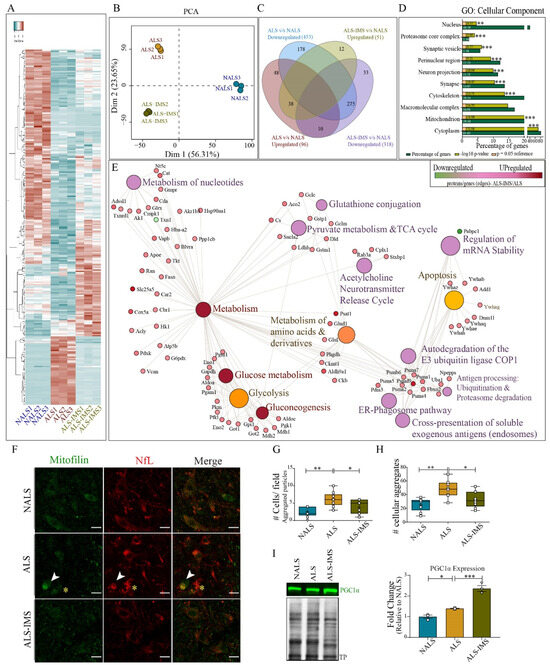 IMS-088 treatment partially rescued the neuronal translational defects induced by infusion of ALS-CSF. (A) Heatmap and (B) principal component analysis showing the pattern of regulation of the neuronal translatome in the groups. (C) Venn diagram of the proteins differentially regulated in ALS and ALS-IMS group when compared to NALS (disease control) group. (D) Graph depicting cellular component of the processes (GO processes) specifically altered by IMS-088 treatment of the ALS-CSF-administered mice (ALS v/s ALS-IMS). (E) Network depicting significantly altered cellular processes or nodes (Reactome) with corresponding upregulated (pink) or downregulated (green) proteins or edges (ALS v/s ALS-IMS). Panel (F) shows spinal cord sections stained with mitofilin (green) and NfL (red). (G) represents the analysis of total number of cells per field with aggregated pattern of mitofilin, while (H) denotes the analysis of overall aggregates per field counted using particle analysis feature of ImageJ (FIJI). (I) shows expression patterns and quantification of the immunoblot for PGC1α from mouse spinal cord lysates (n = 3, in triplicates). * p < 0.05, ** p < 0.01, *** p < 0.001.