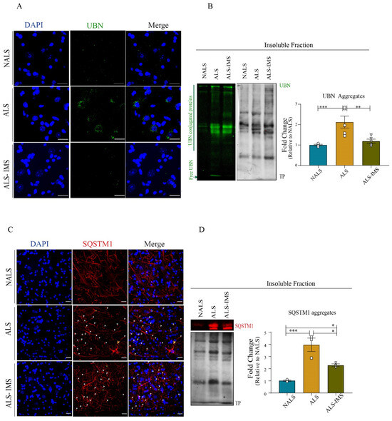 Our observations of altered ubiquitin-mediated degradation pathways converging with phagosomal and endosomal pathways in the neuronal translatome led us to investigate the levels of ubiquitin (UBN) as well as sequestostosome1 (SQSTM1), a marker of proteasomal degradation [29,30]. Immunostaining for UBN revealed an aggregated pattern of the protein in the spinal cord sections in response to ALS-CSF. These UBN aggregates were attenuated upon treatment with IMS-088 (Figure 6A). To confirm this, we investigated the levels of UBN protein in the RIPA-insoluble fractions obtained from the spinal lysates. We observed increased UBN moieties as well as expression in the lane corresponding to ALS-CSF fractions, which included free UBN as well as UBN-conjugated proteins sequestered for degradation. We also observed more ubiquitinated bands in the lane corresponding to ALS fractions. Both the UBN conjugated moieties as well as the intensity of free UBN expression were attenuated in the IMS group compared to the ALS group (Figure 6B).