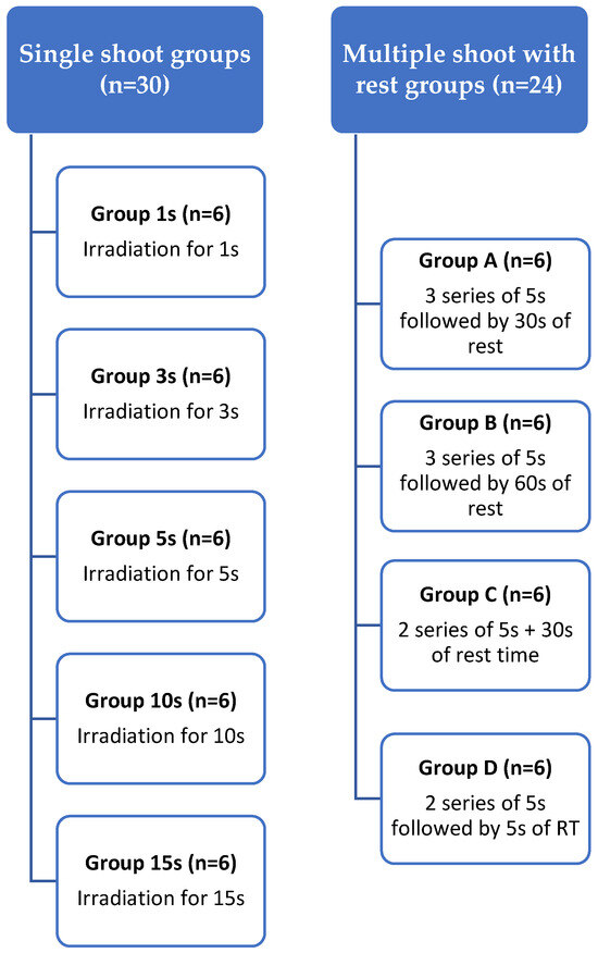As already mentioned, 9 groups were included in total in which 5 groups had a single irradiation during variable times: group 1 s (n = 6) consisted simply of one second of irradiation, group 3 s underwent irradiation for 3 s (n = 6), group 5 s underwent irradiation for 5 s (n = 6), group 10 s underwent irradiation for 10 s (n = 6), and group 15 s underwent irradiation for 15 s (n = 6). Following the identification of the longest and safest duration, additional groups labeled A, B, C, and D were also added to the study.