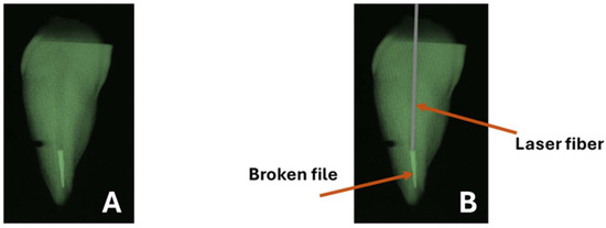 In root canal treatment and re-treatment, numerous complications can occur during the cleaning and shaping of root canals. While some complications can be resolved, others can significantly reduce the prognosis and sometimes lead to complete treatment failure [1,2,3]. In this context, the fracture of instruments in the root canal (RC) during canal shaping is reported to be one of the most common reasons for a negative prognosis [4,5]. The introduction of nickel–titanium (Ni-Ti) instruments two decades ago revolutionized endodontic treatments [6] thanks to their versatile alloy with properties such as memory, super elasticity, corrosion resistance, resistance to torsional fracture, and biocompatibility [6]. However, like all endodontic instruments, Ni-Ti instruments can fracture [1,2,3]. The prevalence of retained fractured endodontic instruments is reported to be approximately 1.6% with a range of 0.7–7.4%; however, it should be noted that studies may not provide representative data since not all fractured instruments are documented [7,8,9,10]. To address this complication, numerous studies have introduced special instruments and techniques for retrieving obstructing objects, such as ultrasonic instruments [11], hollow tubes with a cyanoacrylate adhesive [11], trephining techniques using an ultrasonic tip or a trepan bur [12], endo-extractors [13], and welding with a Neodymium: Yttrium–Aluminum–Perovskite (Nd: YAG) laser [14]. Surgical techniques for the removal of either the instrument itself or the entire portion of the root encompassing the instrument have also been described [15,16,17,18,19]. For instance, Gencoglu et al. [11] obtained a success rate of 93.3% when ultrasonic tips were used under magnification compared to only a 66.6% success rate when conventional methods were used in curved canals [11]. Suter et al. [20] concluded in a study that 87% of fractured instruments can be removed successfully with proper protocols if operating under a microscope [20]. On the contrary, Barbara et al. [21] utilized a Nd: YAP laser in a specific protocol to remove in vitro broken instruments, achieving success rates of 77.3% and 27% depending on the scenario of the broken instrument [21]. In their in vitro study, a brass tube charged with solder was positioned at the coronal end of the fractured instrument, and Nd: YAP laser irradiation was applied to melt the solder with the intention of connecting the fractured instrument with the brass tube [21]. It is crucial to consider that while removing instruments, the benefits must outweigh the potential damage that may occur during the removal process itself [22]. The excessive removal of dentin may lead to perforation or an increased risk of vertical root fracture [22]. Therefore, an evaluation should be conducted on a case-by-case basis, especially because, to date, there is no gold standard protocol available for managing fractured instruments inside canals [22].
