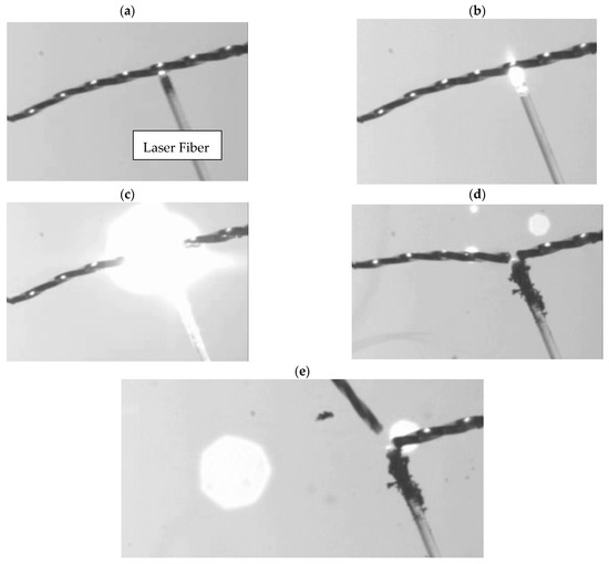 The results of the interaction between Nd: YAP laser irradiation and a nickel–titanium file, captured using high-speed imaging at 3800 frames per second. (a) The laser tip in contact with the Ni-Ti file before irradiation. (b) At the beginning of the irradiation. (c) During irradiation. (d) The Ni-Ti instrument breaks immediately after irradiation. (e) The division of the two components of the Ni-Ti file.