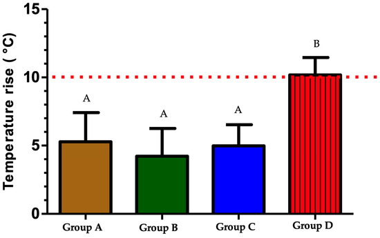 The results of the temperature increase in different groups. Identical superscript letters indicate the absence of a statistically significant difference. The difference in superscript letters indicates a statistically significant difference. p-value < 0.0001.
