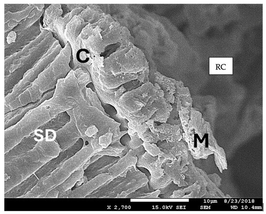 A scanning electron microscopy image at 2700 × magnification illustrating dentinal melting (M) and tubule closure on the canal walls at the site of the complete removal of the fractured file. The healthy dentin located below the thermally affected zone exhibits a normal structure (SD). However, a distinct crack (C) separating zones M and SD is observed. The irradiated root was fractured longitudinally and observed with SEM. RC shows the root canal area at the level of the removed instrument.
