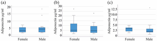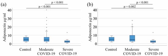 Serum adiponectin levels between sexes in the control cohort (p = 0.385), the moderate COVID-19 group (p = 0.272), and the severe COVID-19 group (p = 0.068) exhibited no significant differences (Figure 3a–c).