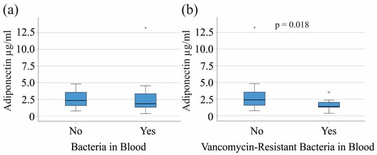 However, the 10 patients with severe COVID-19 and vancomycin-resistant bacteria had reduced serum adiponectin in comparison to severe cases without these bacteria (Figure 4b). Infected patients had lower BMI (p = 0.028) whereas CRP, procalcitonin, and leukocyte numbers were similar between the groups.
