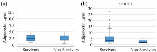 In the severe COVID-19 group, 21 patients did not survive their severe illness. In patients with severe COVID-19, serum adiponectin levels did not differ between survivors and non-survivors (p = 0.837) (Figure 5a). An analysis conducted on the entire cohort, including both moderate and severe COVID-19 patients, showed that individuals who did not survive had lower serum adiponectin levels when compared to those who survived (p = 0.003) (Figure 5b).