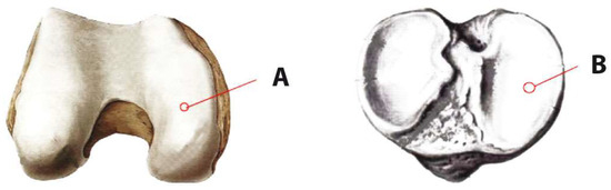 The site of tissue withdrawal in the case of the internal condyle of the femur (A) or tibia (B).