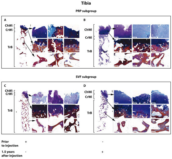 Morphology of osteochondral specimens from the tibia before (A,C) and 18 months after (B,D) HTO in the PRP (A,B) and SVF (C,D) subgroups of patients with KOA. Tr.B, trabecular bone; Cr.Wi, subchondral plate height; Ch.Wi, articular cartilage thickness; 1, hyaline cartilage; 2, mineralized cartilage; 3, subchondral bone plate; 4, bone trabecula; and 5, fibrous cartilage. Osteochondral specimen magnification level, 5×. Scale bar = 200 μm.
